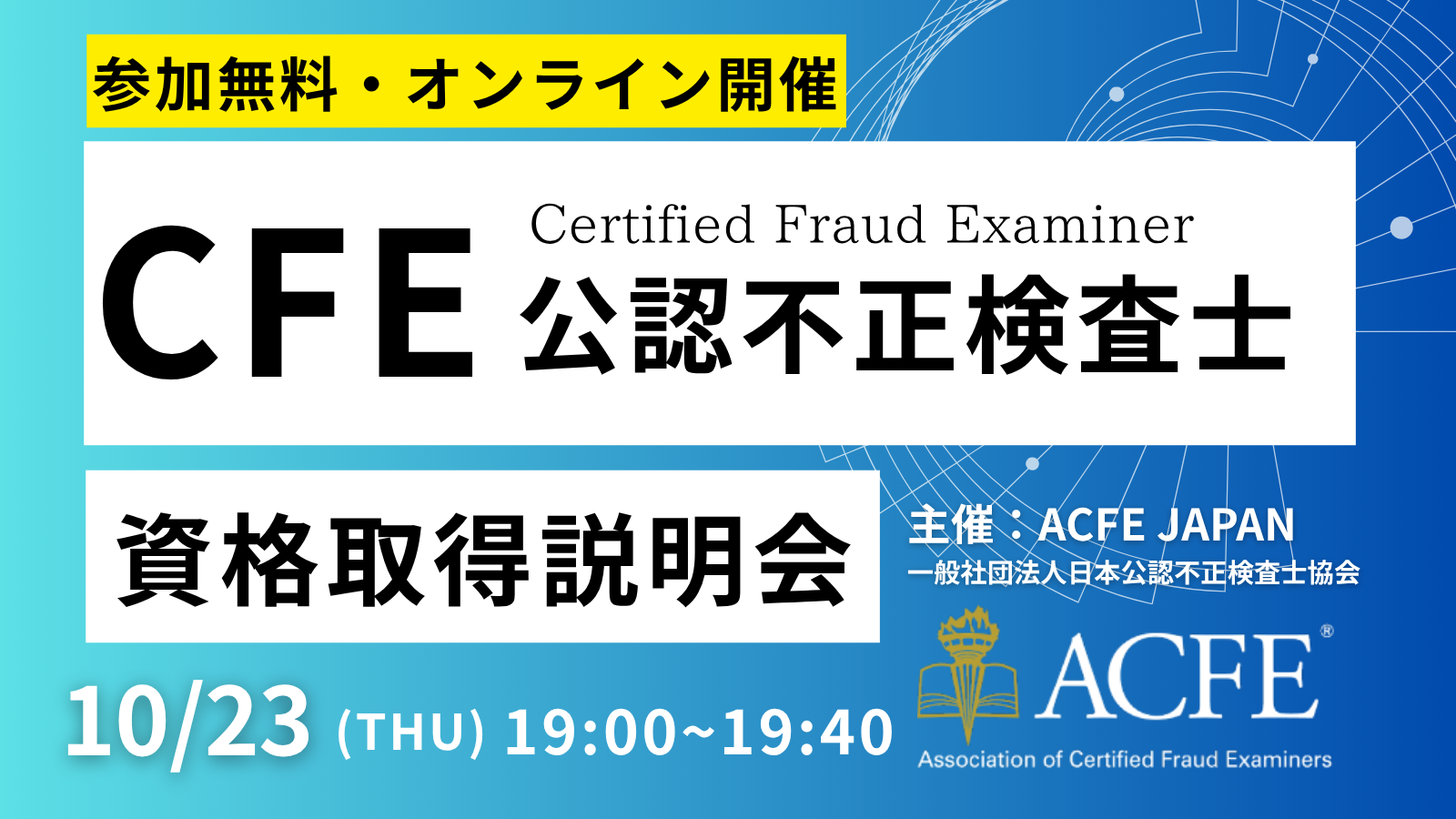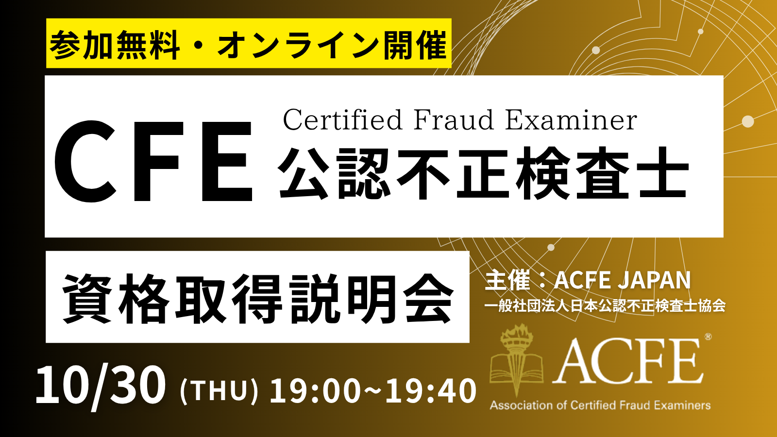 セミナー対象者 | 1)組織として不正対策に興味がある方 2)CFE受験検討中の方、CFE資格に興味がある方 3)これから不正対策スキルを身に着けたい方 4)一般企業の管理部門の方 |
