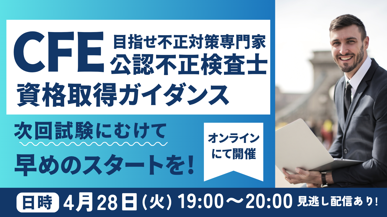 | セミナー内容 | これからCFE(公認不正検査士)を目指す方へ ・CFE(公認不正検査士)とはどんな資格なのか? ・資格取得のメリット ・受験要件、受験方法 ・試験準備について についてお話いたします。 CFE(公認不正検査士)にご興味がある方は、お気軽にご参加ください。 ※見逃し配信あり |